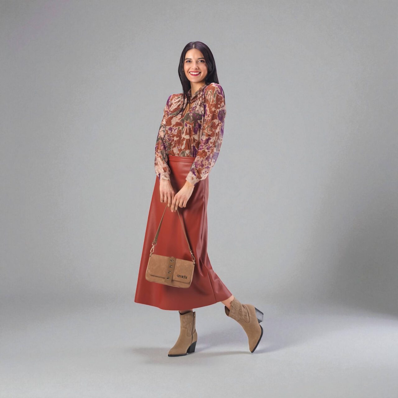Conjunto de falda de polipiel y blusa de gasa estampada