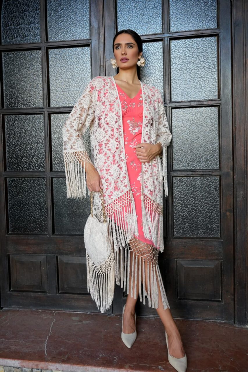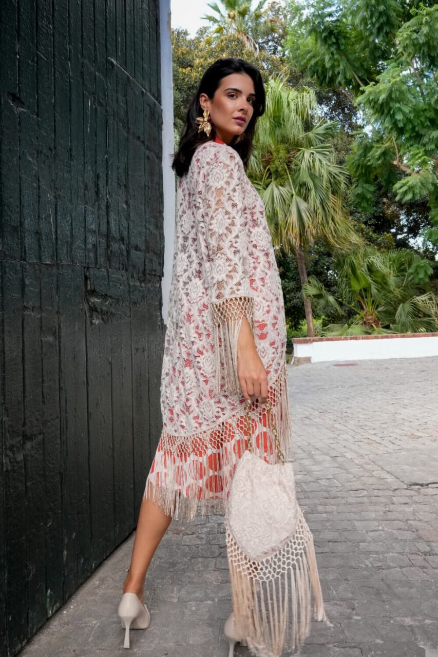 Este kimono reinterpreta los mantones de flamenca desde una perspectiva actual y desenfadada. El encaje de flores aporta textura y romanticismo, creando un efecto visual elegante sin resultar recargado.