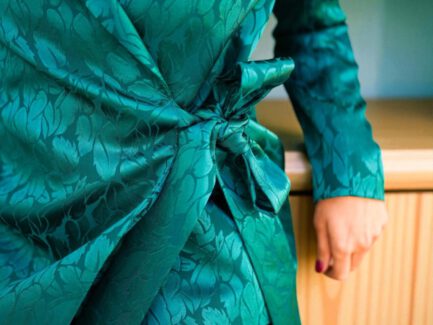 • Vestido de invitada Altea tricolor en punto de seda con drapeado lateralVista lateral del vestido Altea con cremallera invisible y forro interior38%